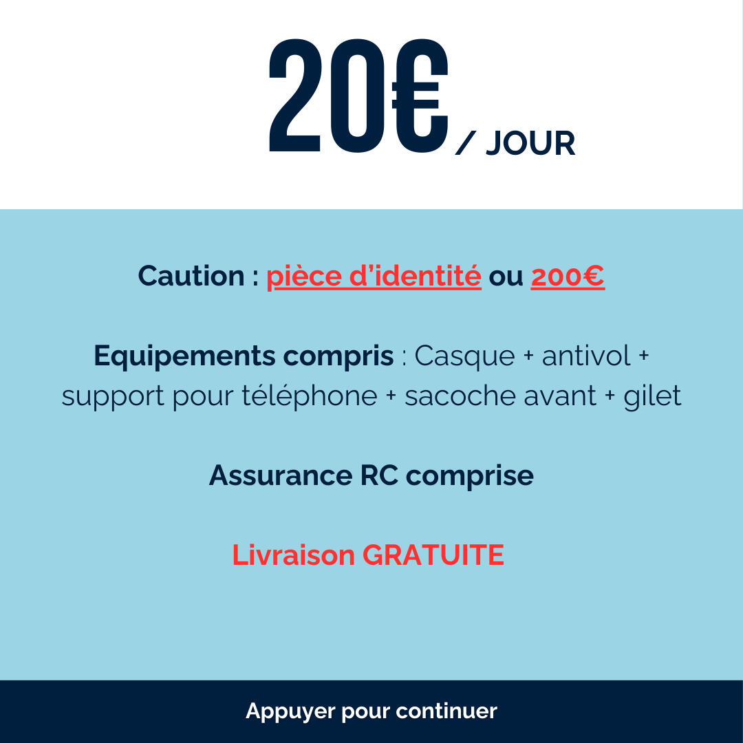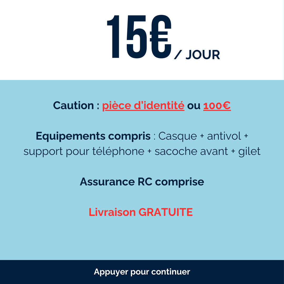Choisissez le Modèle de trottinettes, le Pack Equipement que vous souhaitez ainsi que le forfait de la location qui vous conviendra le mieux et remplissez le formulaire pour une demande de réservation.Vous serez recontactés dans les plus brefs délais pour vous notifier de la disponibilité d'une(des) trottinette(s) et fixer un créneau afin d'être livré GRATUITEMENT à l'adresse de votre choix.Vous avez des questions ou simplement besoin de plus de renseignements ?Contactez le 07 45 53 48 65 ou par e-mail trottloc63@gmail.com !